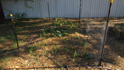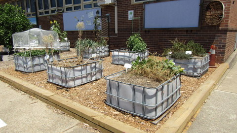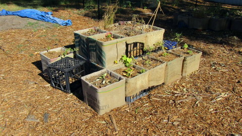 There is an area is at the back of the school, down behind the playing area where there is a 3-sisters garden (corn, beans and squash) being started up and an innovative use of recycled milk crates and hessian bags.