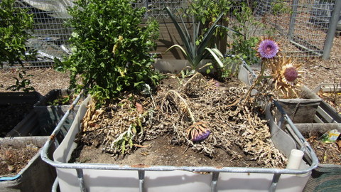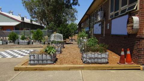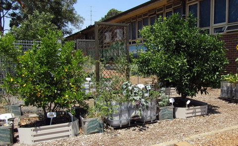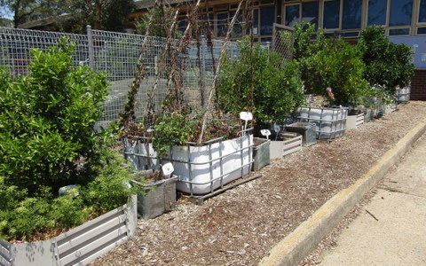 The central part of the garden is a series of raised beds and wicking beds made from recycled IBCs, which is next to an assembly area near the hall, where annual vegetables and fruit trees (primarily citrus) are grown. This is adjacent to a future aquaponics set up (not shown) and a beautiful and calming native garden, complete with meeting area.