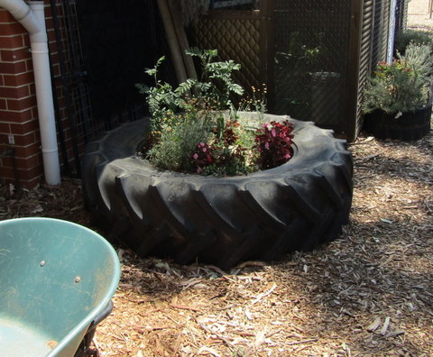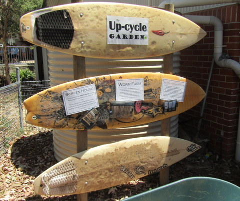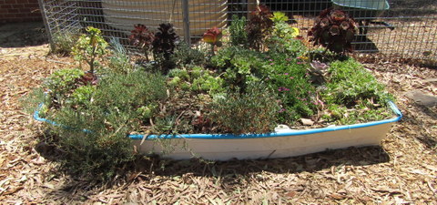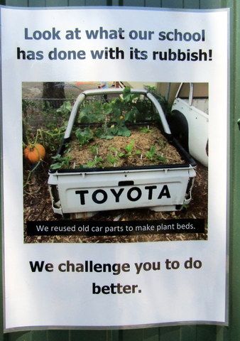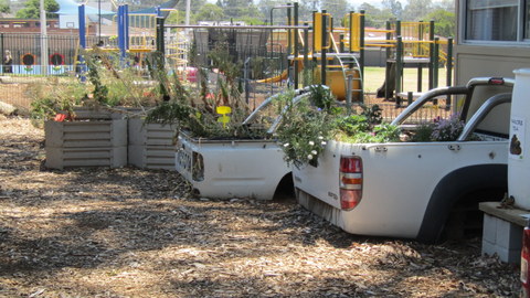 Further towards the front of the school is the Upcycle Garden, which uses the backs of utes to make gardens, an old freezer converted into a worm farm and a very attractive ornamental garden in an old dinghy.