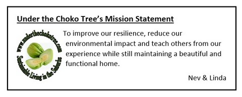 Oh, yes, the title of the site - “Under the Choko Tree” with a subtitle of “Sustainable Living in the Suburbs”. The choko (sechium edule) is a real survival food, prolific and easy to grow, with multiple uses (although they can be a bit bland unless spiced up, unlike this site!). They do, of course, grow on vines not trees but we have an old orange tree which the choko vines grow up every year and this has been christened the choko tree. Thus the choko provides sort of a symbol for the intent of this site.