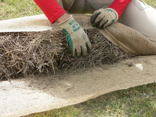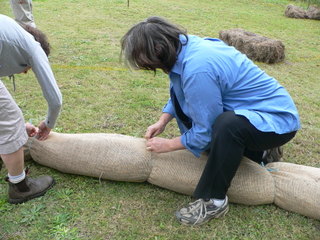 I saw an idea in an American book on developing school gardens for the edging of garden beds using hessian and straw, the idea being that you lay the hessian out flat, place lengths of straw on it then fold it around so it looks like a sausage and wrap string around to hold it together. It is soft for the kid and biodegradable so it will eventually rot down, and that is what we did. We got some 10 metre rolls of hessian from Bunnings and our friend at Mamre Produce donated some straw and we had enough to make 6 keyhole beds which made up part of the mandala. This was a little different to my original design of 8 keyhole beds but we took 2 out so we could allow for disabled students to get access to the keyhole beds too.