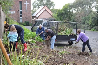 So far we’ve had three working bees to clear rubbish and prepare the soil. The photo below shows the clearing of an agapanthus bed alongside the church car park. Gypsum was scattered to break up the soil and sheep manure has been worked into it. It’s hoped this area will become a herb garden.