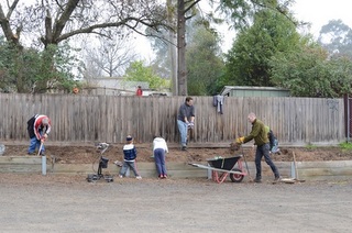 The above photo shows the total herb garden area. The vegie gardens will be in the ‘back yard’ area on the other side of the fence. The photo below shows pathways being laid between the beds.