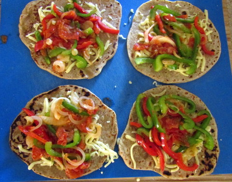 Set up four of the small tortillas as bases, cover each base with grated cheese, top with the cooked veggies, then the remaining tortillas to make quesadillas.
