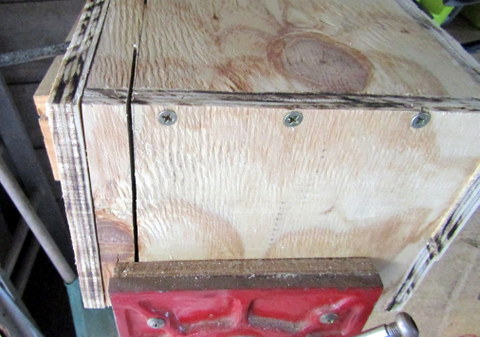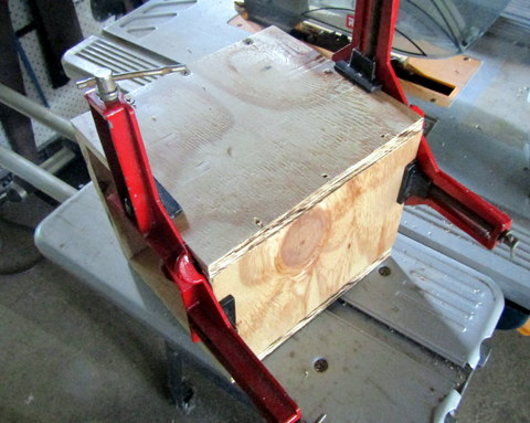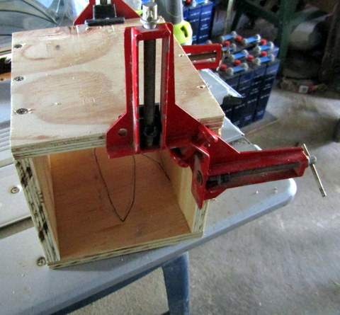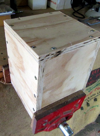 Using 14mm thick plywood I made a box 155mm x 155mm x 205mm high. I cut out 2 pieces 180mm x 130mm, 2 pieces 180 x 155 and 2 pieces 155mmx 155mm. Using a couple of mitre 90° angle clamps to line up the first two sides, then drilled and screwed them using three equally spaced 8 gauge x 30mm chipboard screws. I attached the next side using the same process and then added in the fourth side by anchoring it to the box on one side with the angle clamps, making sure it lined up with the other side, then screwing it into place. It was then a simple matter to secure the fourth corner the same way. I then put the top and bottom on the box using two screws drilled and screwed in on each side of the top and bottom.