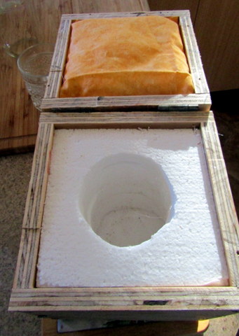 With the little pillow now full, she sewed the hole shut and it was ready to go. It fits very neatly into the inside of the lid and doesn’t fall out when you open the box. The yoghurt maker was now complete. I didn’t spend a lot of time finessing the exterior of the box, because I was unsure of how well it would work, but how well it did work is the subject of the next article: part 2 – the process.
