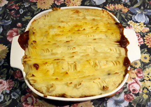 7. Place in the centre of an oven at 180⁰C for 20 to 30 minutes or once the mashed potato has browned to your satisfaction. We have a table top electric oven which we use and it has elements at the top and bottom of the oven. I heat initially with the bottom element, but towards the end I turn on the top element to assist in browning the mashed potato.