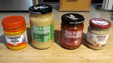 1. If you are making the fresh spice paste, use a mortar and pestle to pound the garlic, chilli, ginger and turmeric to a paste. If you are using the pantry spice paste, place ingredients into a bowl and mix to combine.
