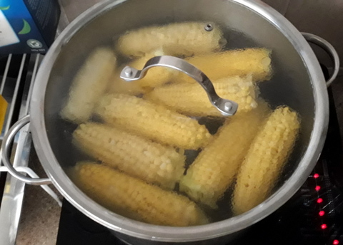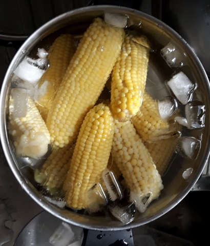 4. With the water on the boil, I carefully placed all the cobs in the boiling water and once it started to bubble a bit, set the timer going for 6 minutes. While I was waiting I filled another pot with cold water and dumped most of the ice into it.