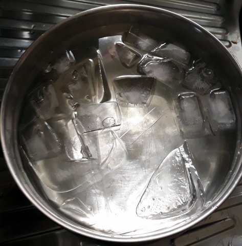 5. When the timer went off I transferred the corn cobs to the ice water, agitating them to make sure the cold water hit all surfaces of the corn, and left them to cool for 8 to 10 minutes.
