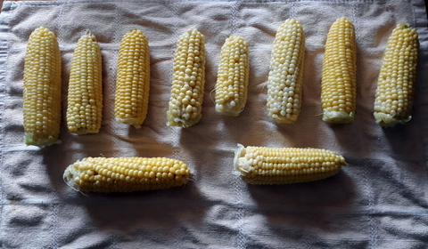 A couple of days ago I prepared another 10 cobs, using pretty much the same process as I listed it above. The only change I made was to use a larger vessel to hold the ice and water to cool the cobs in, and I perhaps used a bit more ice. This did seem to cool the cobs down a bit quicker, and I left the cobs in the icewater for 15 minutes rather than 10 minutes. It did a better job of cooling them down prior to freezing!