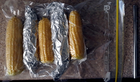 7. My intention was to freeze five cobs in each of two bags. Once dried, I covered two cobs with aluminium foil then placed them with three uncovered cobs, arranged alternately into the plastic bag. I then used a metal straw to suck the air out, slid the straw out quickly and zipped the bag shut. The bag then went into the freezer and I repeated the process for the second bag.
