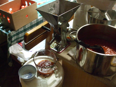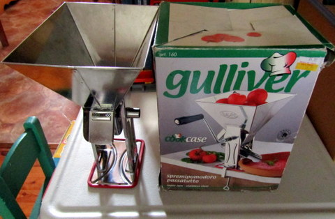 For years we used the ‘fruit press’ referred to in the original article and while it was lots of fun and extracted the good stuff in one pass, it was PAINFULLY slow. To process half a dozen jars did not present much problem but the number of jars we were looking at these days it just did not cut the mustard. So we looked around to see what else there was (check reviews here) but settled on a ‘Gulliver’ brand tomato squeezer. It is a bit of a pain to clean, but it is so much faster than the fruit press, that I could whip through 5 times the jars in half the time of the old one.
