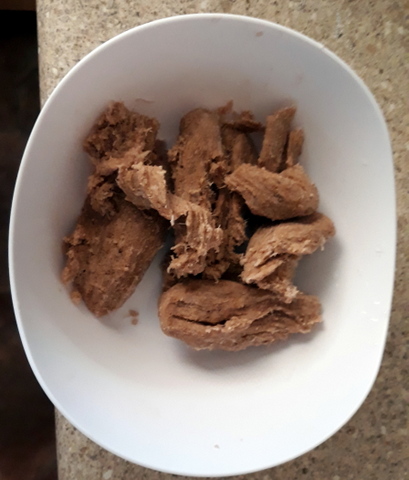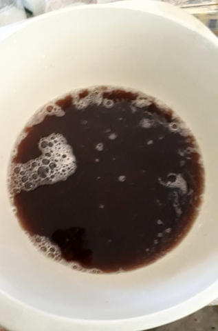 I then replaced the squeezed out nuggets into the original bowl, added some water and swirled it all around to re-mushify (technical term) it, then re-squeezed it out again to extract any remaining starch. At this point the starch and water mix in the second bowl was an interesting reddish brown colour that the photo really does not do justice to.