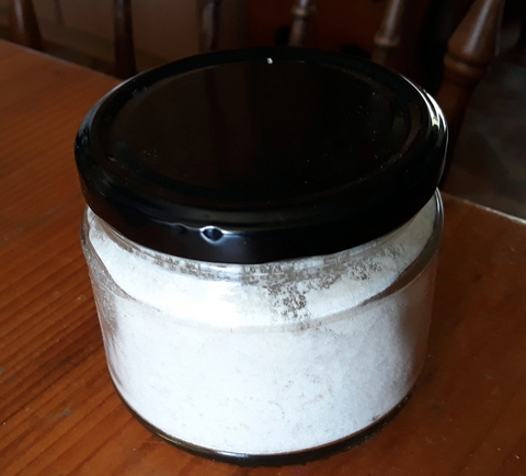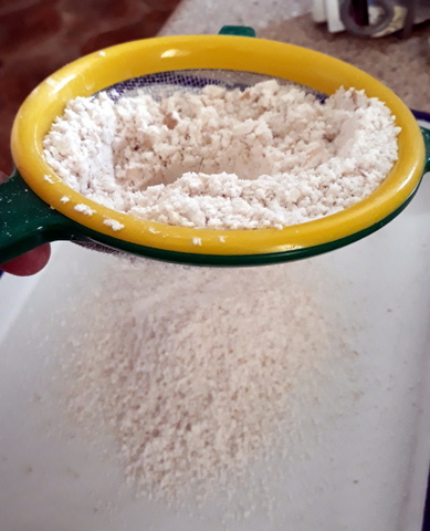 The next morning it appeared to be dry enough, so I passed it through our finest kitchen sieve. The resulting powder was not as fine as the commercial stuff but seems to work OK. I could possibly have tried passing it through a layer of the cheesecloth or some other fine material mesh, which would have given me a finer powder. For those playing at home, out of the unpeeled 800gms of rhizomes I got a yield of 82gms of arrowroot flour. It is clear from this that I did not get the best yield possible and I will not be putting Arnotts out of business by competing against their arrowroot biscuits!