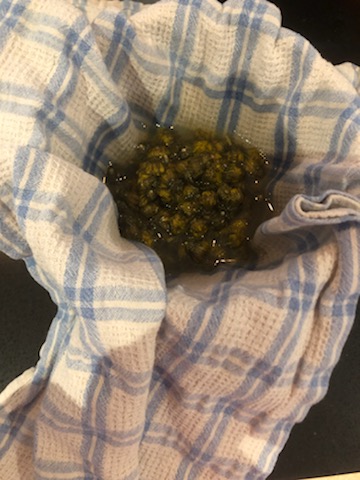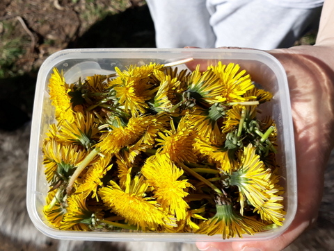 We wandered out and over a period of about an hour or so were able to harvest two cups of dandelion flowers and my daughter did the heavy lifting on making the honey –
