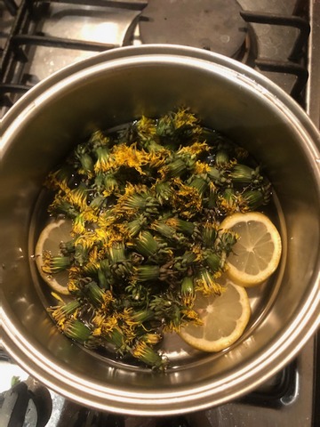 1. She added the two cups of dandelion heads, minus the stalks into one and a half cups of water, and then added three slices of lemon. She then heated the mixture to a simmer and simmered it for 15 minutes, let it cool and left the mixture to steep overnight.