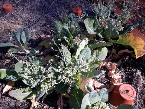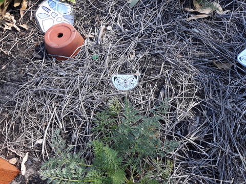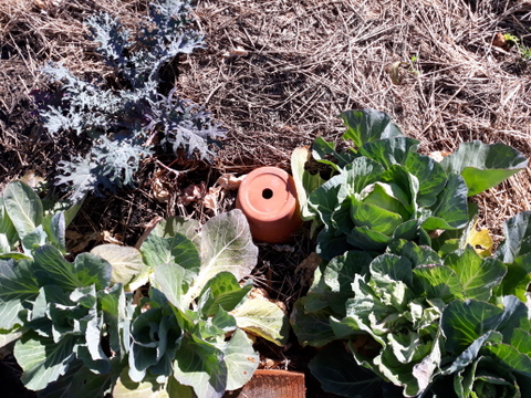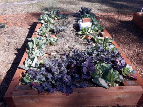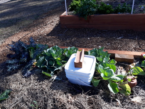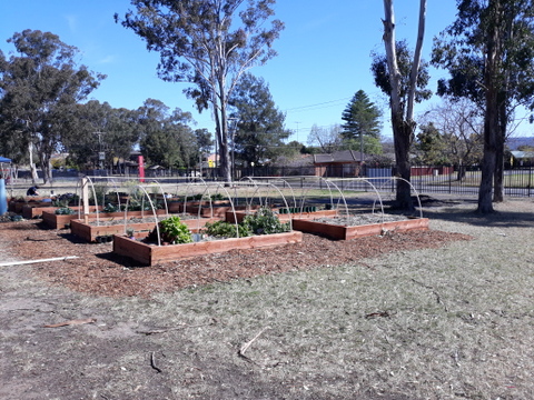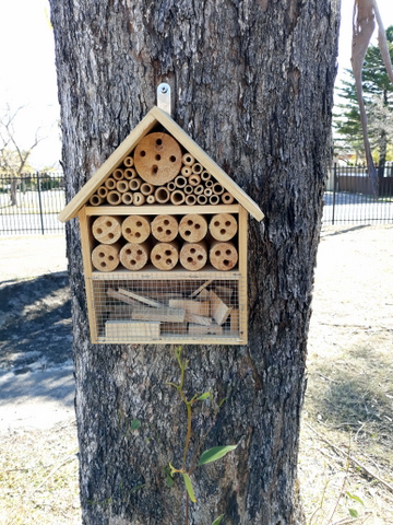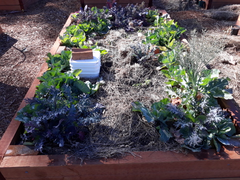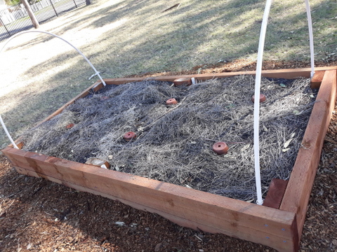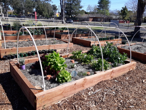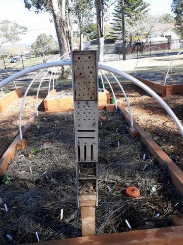 The project is still ongoing with all beds having 6 ollas for watering but only 4 beds having worm towers to assist in fertilisation. Two thirds of the beds now have a framework of PVC piping installed to support 50% shadecloth on the western side of the beds. The PVC pipe is in the process of being painted green to extend its life by providing protection against UV from the sun. There is a townwater tap 3 metres away from the south east corner of the garden for irrigation. Bee hotels and insectary plants are provided to attact beneficial insects into the garden, and if the number of predators such as ladybirds is anything to go by, this has been a success.