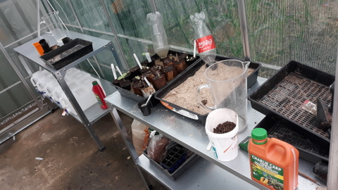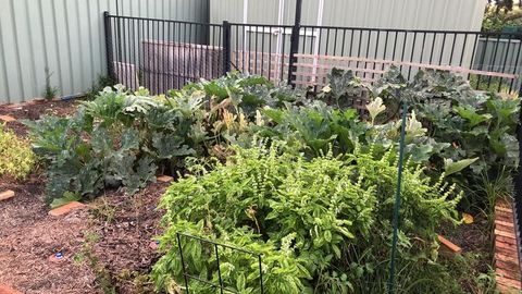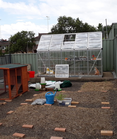 The area is a good size, about 9 by 12 metres with the long axis being roughly east/west in aspect. It is a raised area so drainage is just about guaranteed, surrounded by a pool fence which works well to keep their dog ( a husky) out of the area. At the eastern end is a decent sized concrete platform which has turned out to be an ideal space for a greenhouse, and at the western end (outside the fenced the growing area) is a pre-existing large garden shed for tool storage etc.