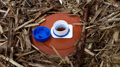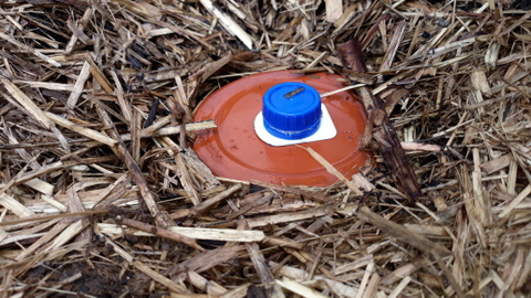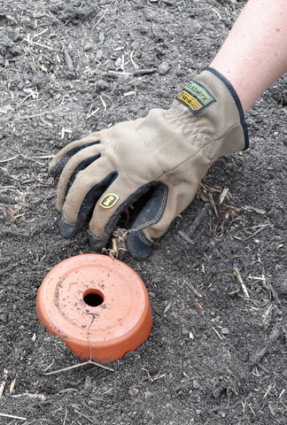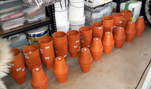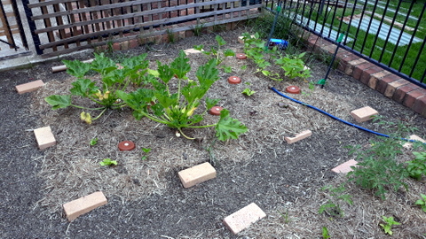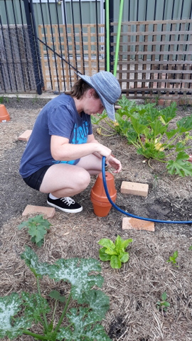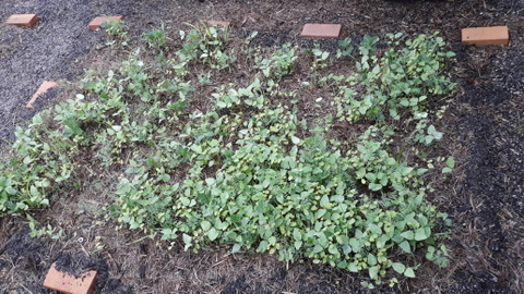 They marked out eight veggie beds with bricks to the same footprint as the chook shed/run (ie 0.75m wide by 2.0m long) and each area given a mulch of sugar cane bagasse. The chooks now spend a month on each patch, digging it up, mixing the mulch with the soil and including their manure as fertiliser. Once the bed is well dug over and fertilised the chook tractor is moved to the next patch, the original one is smoothed over, 8 ollas are dug in on a diagonal pattern, and it is re-mulched and planted out with vegetable seedlings.