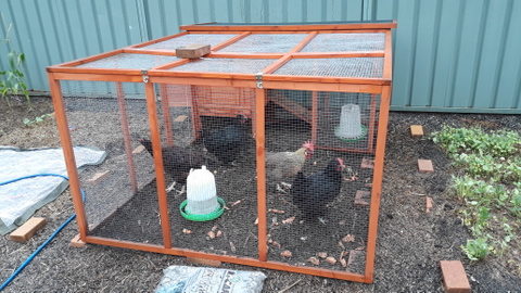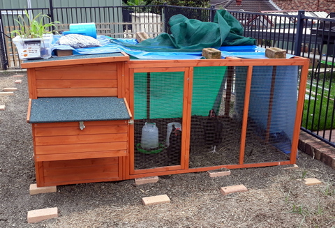 They removed the chooks and covered the weeds and grass with a layer of cardboard and then had a layer of topsoil blown in. A chook run to fit the pen was purchased, with the entire shed/run being used as a chook tractor.