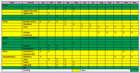 There are very good things that come from planning. I unfortunately didn’t figure that out until I discovered permaculture twenty odd years ago. When I did my PDC about 15 years ago, I was introduced to the idea of a Fruit Harvest Calendar which allows you to work out when your existing (and prospective) fruiting plants will produce, so you can arrange for year ‘round fruiting by varying the species and varieties of the fruit you grow. I did one during the course and found it very educative, but I need to re-do it to reflect the fruiting plants that have come and gone in the intervening years.
