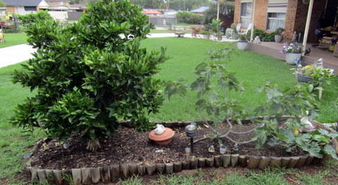 Small Fruit Tree Area – At almost the southeast corner of the front yard that used to house a small, scrappy and very unhappy bottlebrush, which we removed and now have a small built up area that was originally home to a blood orange and a dwarf fig (that doesn’t seem very dwarf anymore) and that was recently expanded to include a dwarf lemon. It is watched over by ourselves and our lovely next door neighbours. For more detail on the small fruit tree area, click here.