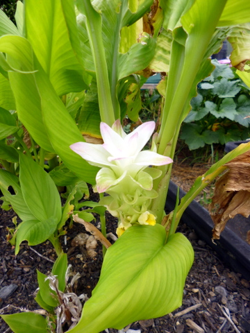The books say the plants can grow up to a metre tall, and ours would reach that easily. They contribute to giving the backyard a wonderful, tropical feel and the turmeric flower is a real treat, so as well as being edible the plant is attractive too.