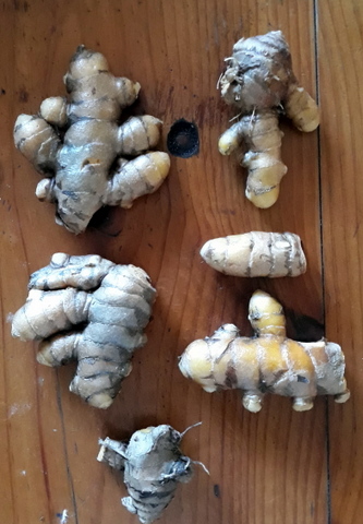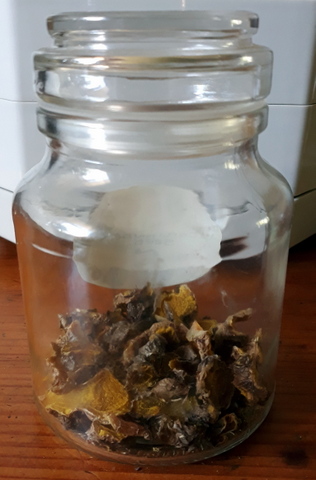 OK, the next bit is based on very little thought and not much evidence, but here goes anyway! It is a generally accepted fact that whole spices will retain their flavour and aroma longer than the ground variety, mostly due to the very fine particle size of ground spices allowing volatile compounds to escape. Based on the same theory, we are retaining the dried turmeric rhizomes in the glass jar and only grinding them as we need to for use.
