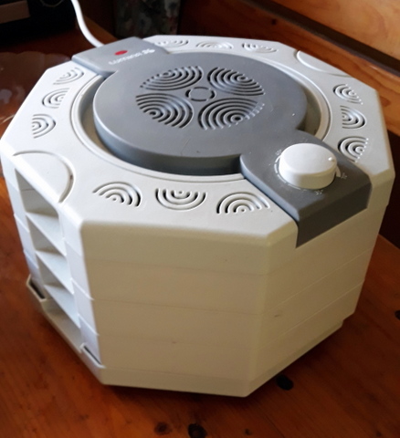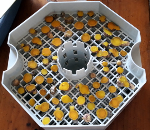 As previously mentioned, I had it in my head to use our solar drier to dry the cooked turmeric, but being winter and the weather was lousy for dehydrating food, I elected to borrow an electric dehydrator from my daughter and use that. There was another issue also – from previous experience I know that the best I can get out of my solar offset drier is 60⁰C, while the books I have read specify 70⁰C as the best temperature. Is the extra 10⁰C significant? I have no idea! But I thought I should mention it anyway and the dehydrator I was using would go up to 70⁰C, so that was it!