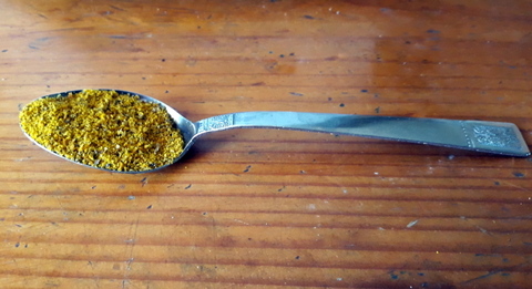 While being a fun process, it has not given us the powdered spice we are looking for so the next trick is to grind them up. We have a spice/coffee grinder, but I am sure you could get away with using blender or some such. I tossed a small handful of the dried turmeric into the grinder and ran it for several bursts of a 10 to 15 seconds each. This resulted in a powder of variable particle size, so I sieved out the fine stuff using a kitchen sieve and returned the bigger stuff for another round and so on. I think I need a finer sieve but generally the powder seemed to work well when incorporated into a veggie curry!