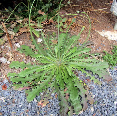 The plant has long narrow leaves with a wavy margin, very unlike the jagged tooth-like leaf edges of dandelion. Their yellow flowers are supported on narrower stems than dandelion which can be unbranched or with one or two branches.