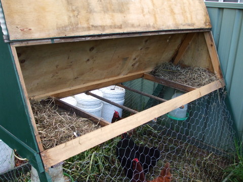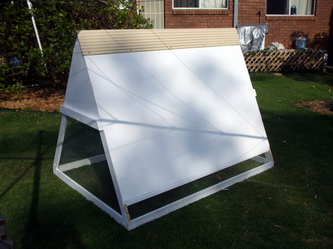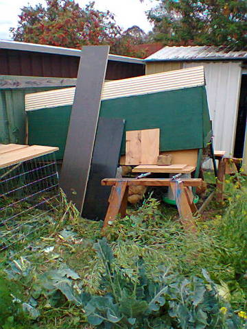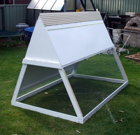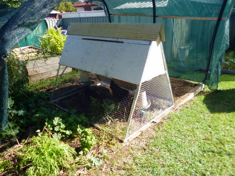 As performance goes, it worked every bit as well as the previous one, almost, but was much lighter. As time went on however, some flaws in the design did show up, particularly in hot weather. One difficulty was that with the bottom area entirely surrounded by chook wire, there was very little relief from the western Sydney hot afternoon sun, almost no shade at all. This meant the chooks had to take refuge in the top roosting section, whereupon the other issue became obvious. That lovely British racing green top area sucked in the heat and got much too hot as well. In the end I wound up tossing some shade cloth over the whole thing to try and cool it off.