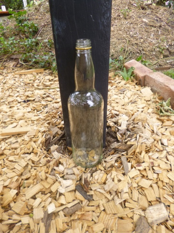 To add the reservoir my original thought was to set it up so that a 1.25 litre or 2 litre PET bottle would do the trick. To put it into place I used some more silicon to attach a 50mm floor flange upside down to the bottom of the pot in the centre. Then I would put some 50mm pipe with holes in it into the upside down flange and stick the PET bottle on top of that. The problem was that it was for the front yard and the PET bottle would look like crap! So I decided to use a spare 750ml glass (ex cordial) bottle with a longer neck which would be much more stable and have a better ambience (for the birds I mean).