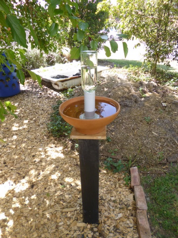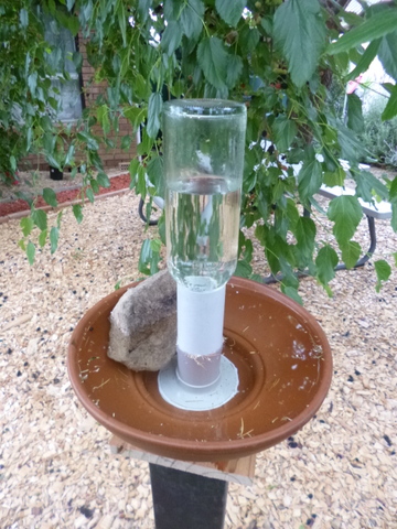 I cut the length of pipe such that the lip of the bottle was about 12mm below the rim of the dish, so that when the water level dropped below that point water would flow from the upturned bottle into the birdbath, refilling it. To facilitate this water flow I drilled a series of 3mm holes around the pipe about 25 – 30mm below the rim of the dish.