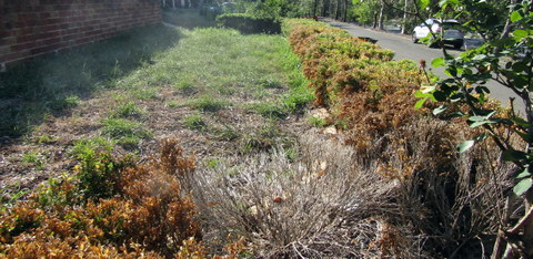 The area to be remade is the lower (closer to the street) terrace of the front yard, which currently has a moulded edging a bit over half a metre from the edge. The area marked off by the edging contains a hedge of box plants of which a considerable number are partially or completely dead. There is a rose bush at either end, in the corner. This area is also covered by a decorative mulch of white stones. The open area between the hedge and then brick backing wall is covered by various grasses. The terrace as a northerly aspect.