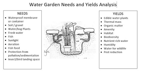 So now you have a list of needs which your element (in this case water garden) requires to be satisfied if it is to be productive. It will also have yields or things it gives back to you which you need to identify and write down, again, being as creative as you can. For our hypothetical water garden you want to get back something edible from your water plants and also you want it to be nice to look at. Other less obvious yields are microclimate effects from the thermal mass of the water, nutrient rich water which can be used to fertilise plants and improved biodiversity in your yard due to the availability of water which will attract new species.