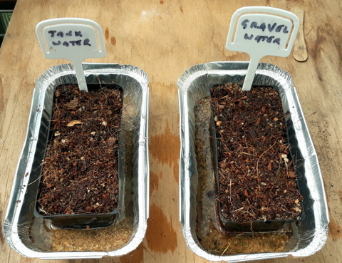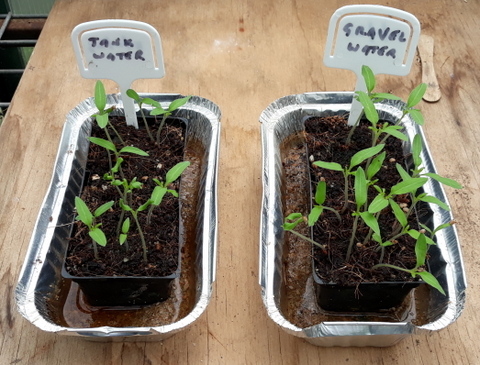 I picked a bucket of gravel from various areas and brought it home, then soaked 3 litres of the gravel in 3 litres of tank water for two hours. I then decanted the gravel water into a bottle. I filled a couple of punnets with my own seed raising mix and sowed tomato seeds (‘Moneymaker’ variety for those interested) and set the punnets up side by side in the greenhouse in separate containers. I labelled each punnet and proceeded to keep them watered with either tank water or gravel water for two weeks. The tomato plants treated with gravel water have reached the four leaf stage well and truly without any evidence of yellowing or stunting. If anything, they seem a bit happier than the control seedlings!