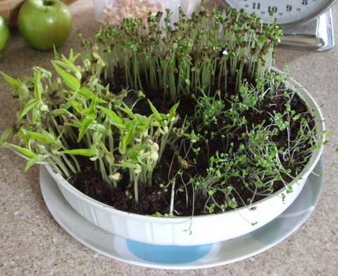 Microgreens in a similar way the seed is sown thickly in a seedling flat, kept watered and allowed to grow to the four leaf stage or a bit larger, then harvested at the soil surface with a pair of scissors. In both cases all that is needed is to produce some edible leafage and stems, so whether the crop is true to the parent stock is immaterial.