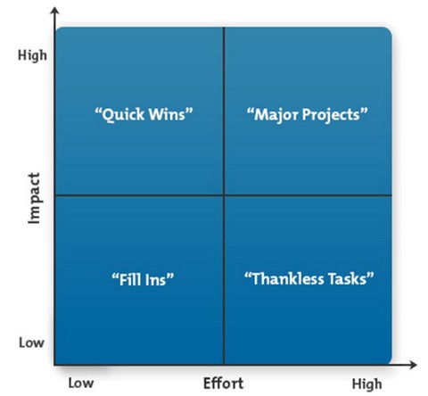 Strategies with high impact and low effort are obviously a high priority, labelled as “quick wins” in the matrix you get a good outcome with a minimum of effort. If there is high effort but also high impact these “major project” strategies are good but need to be well programmed to make sure the resources are available for their completion. Also one major project may take the place of several quick wins, in terms of the resources which can be committed to it so this must also be factored in.