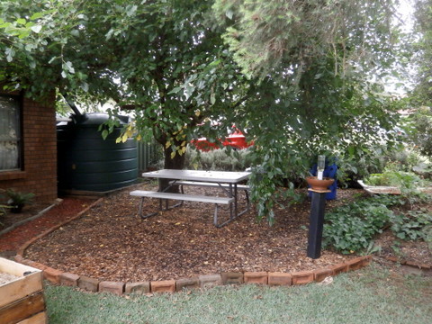 The area in front of the house, under the mulberry tree, has been covered with wood chip and seats provided as well as a child’s swing installed. This area has also had the strawberry tower and biopod but these have been removed and the area set aside for recreational purposes. A path has been placed between the concrete path and the park area, further reducing lawn area. See below (Completed)