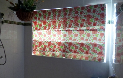While we have done pretty well growing vegetation along this part of the back of the house to protect it from the harsh western sun on those hot western Sydney afternoons, there are times of the day when the bathroom and toilet windows are quite exposed. For these times we have polystyrene sheeting which is cut to fit the inside of the window surround that fits in and reduces the problems considerably. We applied some contact to dress it up a bit!