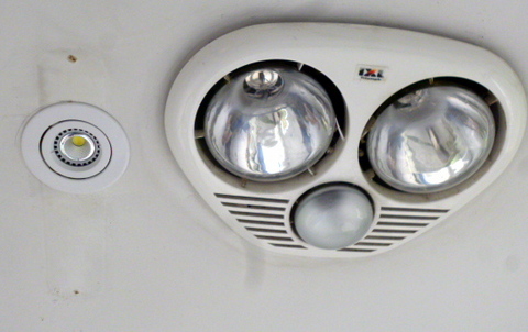 The energy to the bathroom is primarily solar, with hot water coming form an evacuated tube solar hot water system, and the main light being an LED downlight supplied from the remnants of the old 12 volt system, now integrated into the new 24 volt system. There is a fan/heater/light installed which the new system runs through the inverter without difficulty although mostly it is the LED which we use for lighting.