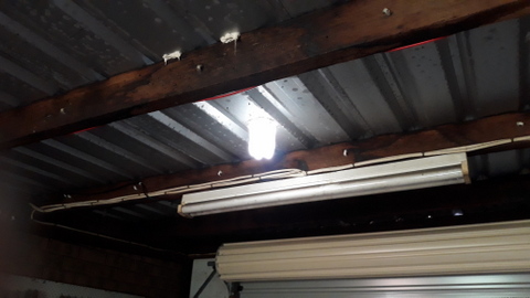 Our garage is a multipurpose building that is much more than just a place to keep the car, in fact a car has not seen the inside of it since the early days. It is a simple rectangular building roughly 8 metres by three metres, with the front (eastern end) enclosed in brick the same pattern as the house and bearing the roller door, the south and west walls are constructed of a hardwood frame and enclosed with Hardieplank, (and yes, Hardieplank of this vintage contains asbestos, so no cutting or drilling). The north wall is common with the south wall of the house. The roof is rib and pan galvanised sheeting over hardwood joists, sloping down towards the back of the building.