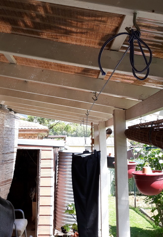 8. Drying washing – It is an undercover area which we use to dry washing in times of inclement weather. The inboard row of hooks I was going to use for the hanging baskets was been strung with washing line and pressed into service to dry washing. We also have a couple of portable aluminium fold up washing lines which we can also set up on the deck as needed to provide more drying space.