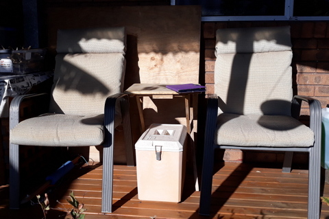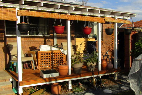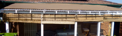 1. Sun Protection - The original idea was to protect the back of the house and it does that admirably. The roofing is clear polycarbonate, but that is covered with 2 layers of 90% shade cloth so that the deck is protected from the summer sun, but the covering can be removed to give us access to the warmth of the winter sun. There are bamboo blinds along the outside edge of the deck which prevent the sun from hitting the deck directly when rolled down. The sun does sneak past the southern end of the deck but I have installed another bamboo blind hanging from the eaves, which covers this tiny chink in our armour.