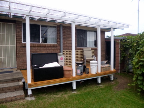 First on the agenda was insulation, then I needed to put up a deck to act as a barrier between the kitchen and dining room space and the hot western Sydney sun. The first one I built many years ago and with somewhat less knowledge and skill it turned out to be not so ideal. I took it to the width of the back landing and it should have been wider, some of the timber used, while being recycled, was not up to the task and it did not cover the back door very well.
