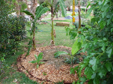 When we first built a banana circle in the front yard almost 15 years ago, we did it by the time honoured method of digging a hole and then mounding up the dirt around it, then filling the hole with organic matter. Due to the incorrect placement of the banana circle, it didn’t work and so had to be transferred to the back yard (where it flourishes today). One of the factors that contributed to its failure was that the mulberry tree provided too much shade for the majority of the year.
