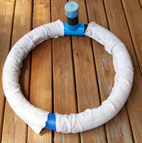 Years ago, I dug in a circle of buried pipe irrigation to allow me to keep things watered, but the seedlings are still pretty small and would not have the root depth to get close enough. So I have been hand watering them and have found that digging a small channel just down the slope from the flowers planted on the inclined part of the mound allows water to soak in rather than run off.