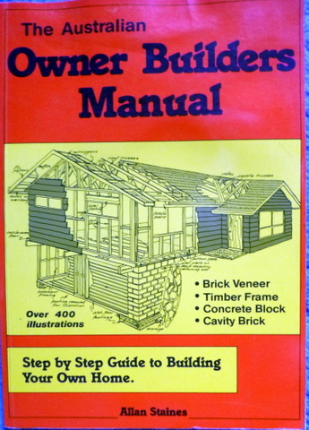 The Australian Owner Builder’s Manual – Allan Staines – Pinedale Press (AUS) 1990 ISBN 0 9593024 1 7 – This manual covers it all for the owner builder including owner building regs, getting plans drawn up and whether to build in timber, brick or block. The technical chapters cover concrete footings and slab floors, timber floors and subfloors, wall framing, roof construction, finishing and brick veneer, cavity brick and concrete block details. A “Miscellaneous” section covers services, corrugated iron roofing and flashing, among other things. Lots of line drawings.
